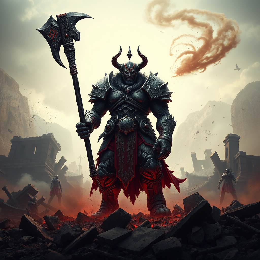 Capture a hyper-realistic photograph of Worldbreaker Sion in a chaotic, apocalyptic landscape, showcasing his massive, towering physique and intricate armor. Use advanced lighting techniques to highlight his signature axe and employ dynamic posing to emphasize his fierce, unrelenting expression, conveying a sense of power and destruction. Utilize a muted, desaturated color palette with strategic pops of red and black, capturing the essence of Sion's catastrophic, world-ending nature. Add creative modifications to the landscape, such as crumbling ruins and swirling clouds of dust, to enhance the atmosphere while maintaining the core concept of raw, destructive power.