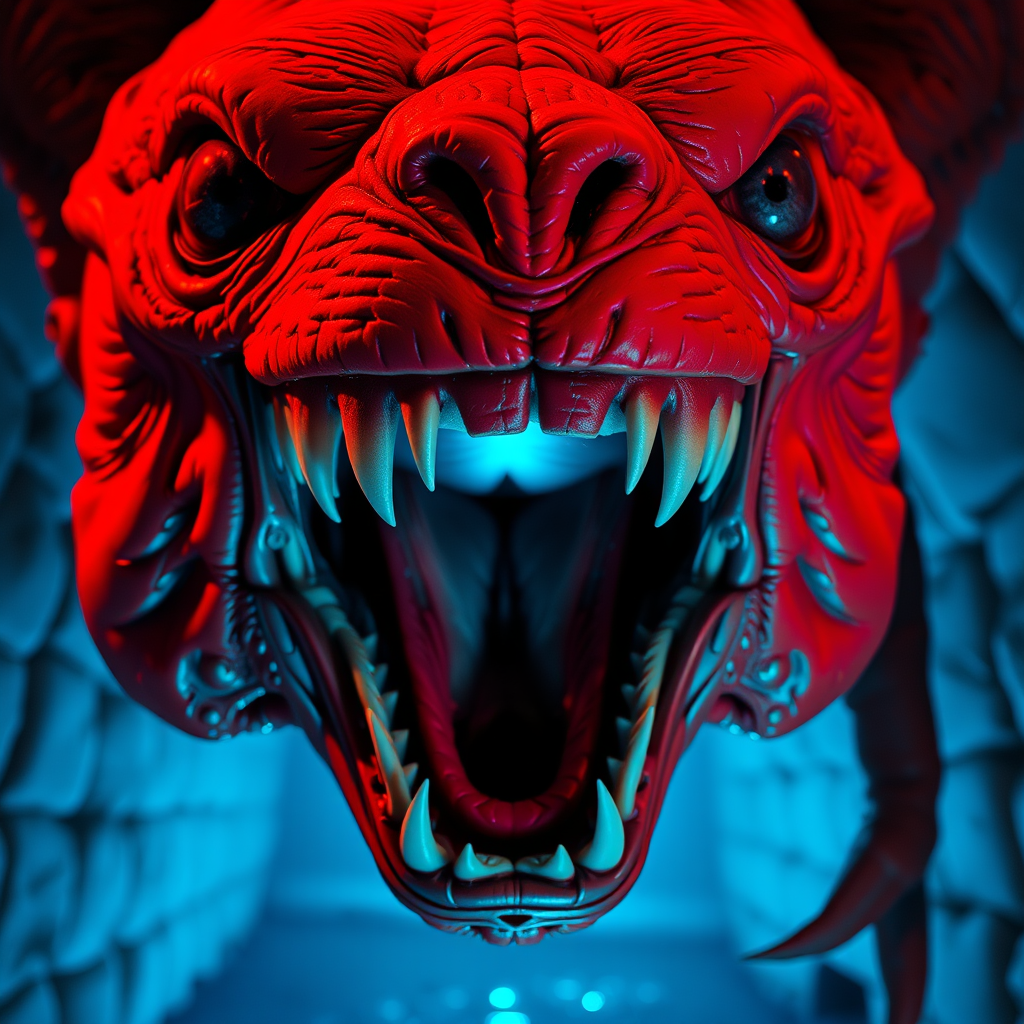A vivid close-up of a menacing creature with its mouth open wide, inspired by film key art, in the style of Charles Fremont Conner. The image features a detailed full-body portrait set against a clear, dimly lit background. The creature is captured in a bright, electric blue environment, reminiscent of a sewer setting. The dynamic, vertical composition focuses on the anticipation of a bite, with a resolution of 1024px. The artwork reflects a haunting yet captivating essence, merging dark intrigue with vibrant hues.