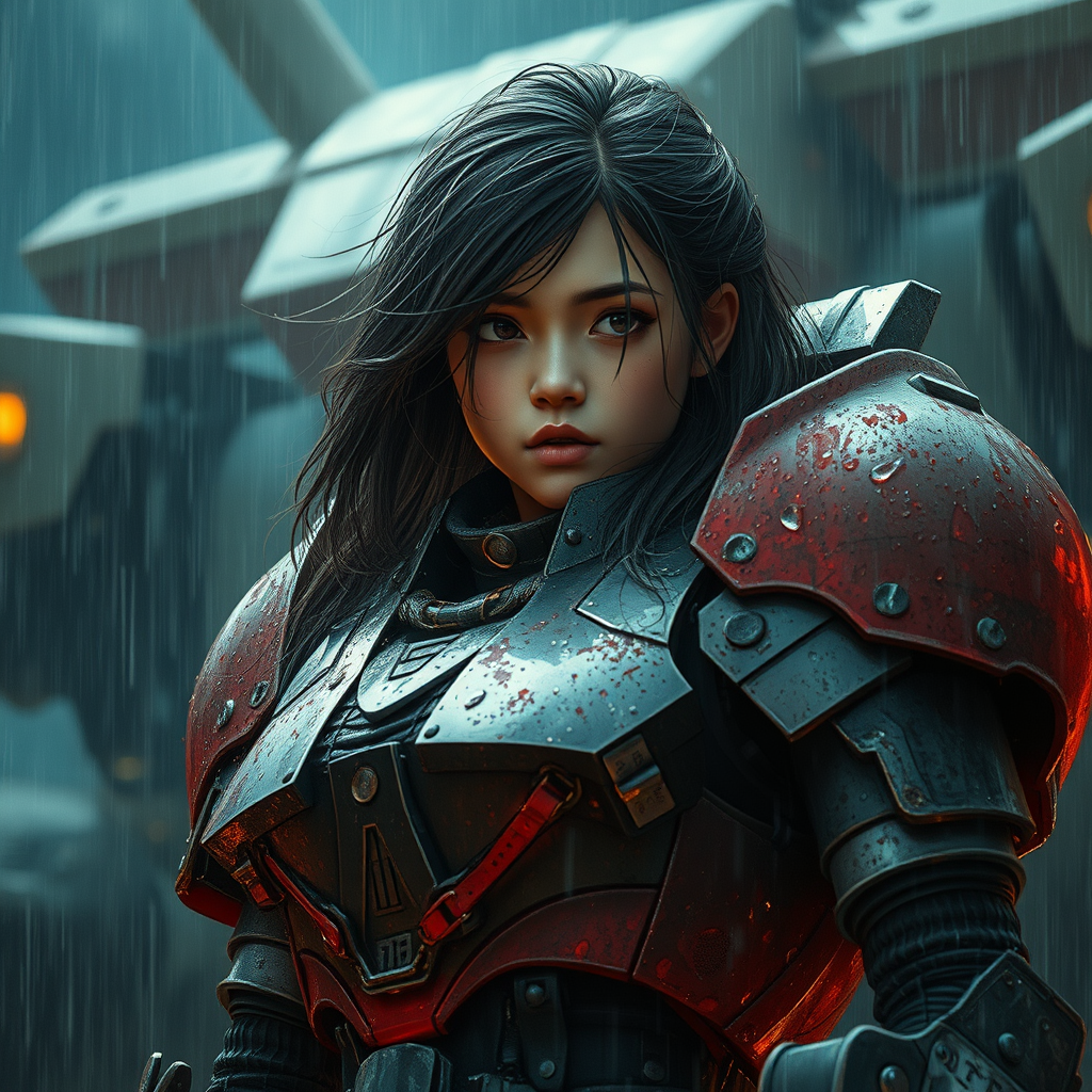 A young woman adorned in battered mecha armor stands amidst a stormy night, engaging in an intense battle. Her armor is scarred from combat, reflecting the dim, rainy surroundings. Her face, captured in vivid detail, conveys resilience and focus. The scene is cinematic, every drop of rain shimmering as it falls, creating a surreal atmosphere akin to a divine, celestial battlefield. With inspiration from manga and anime, the environment bursts with intricate details and vibrant colors, highlighted by dramatic lighting. Despite the hyperrealistic portrayal, subtle imperfections and the chaos of battle add an authentic edge to the scene, with occasional elements slightly out of alignment, echoing the tumultuousness of the moment.