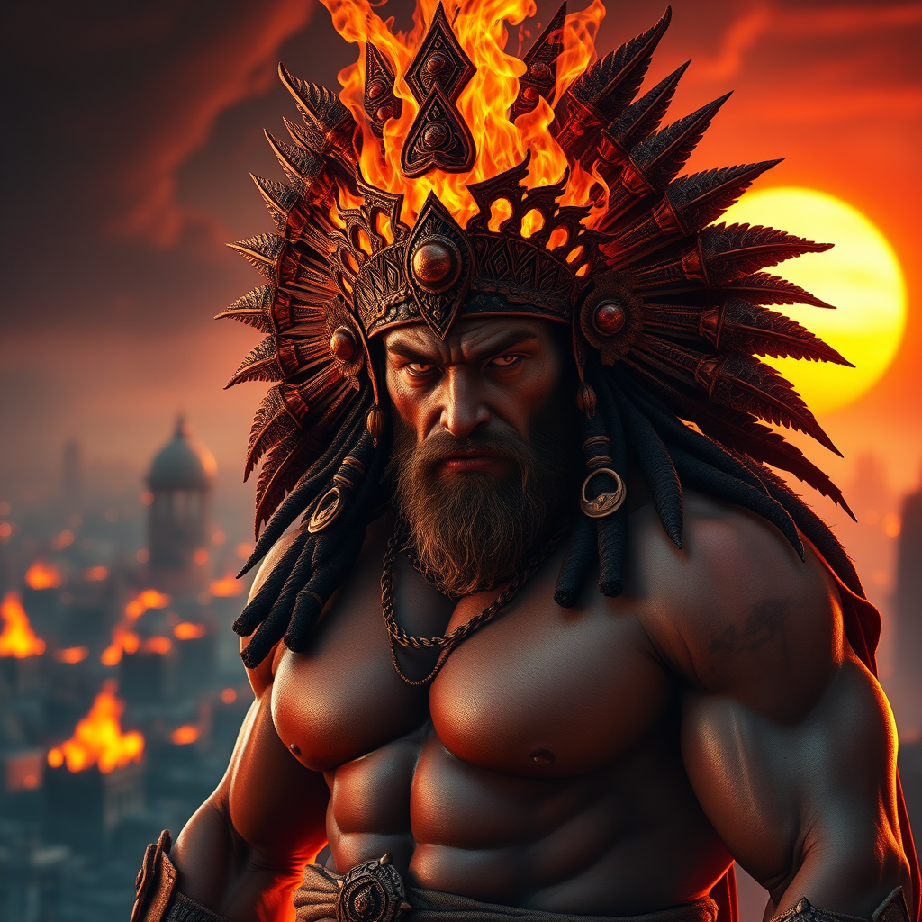 Dramatic lighting, hyper-realistic, hyper-detailed, highly detailed head, face, torso, arms, hands, legs, feet, full body, fierce and savage looking male, dark theme and aesthetics, muscular and brutal, burning city in the background with a setting sun, warm colors that complement orange, red, and turquoise, ancient era, wearing epic attire as the focal point, colors echoing a sunset, extremely vibrant colors, adorned with a majestic flaming headdress made of intricate elements, 35-year-old man, mythical themed, commanding presence.