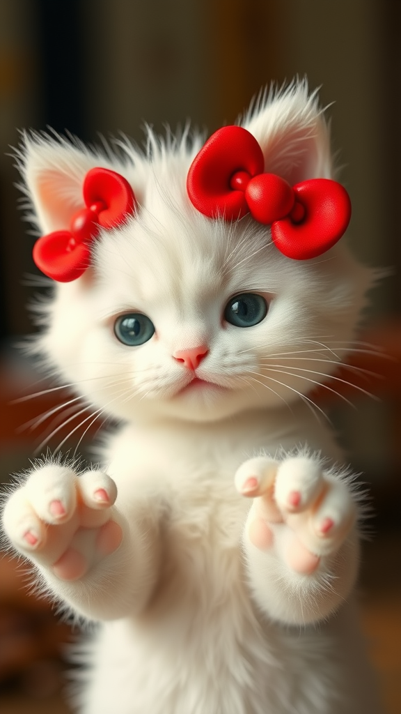 hello kitty as a human form, with soft white fluffy hair and bright red hair bows, capturing the essence of cute feline charm. Inspired by cats and hello kitty, features quirky anatomy like unusual hand shapes with missing or extra digits. Elements of blurry text and occasional cropping create a unique visual style. The overall quality varies from intentionally low to normal, presenting a blend of charming imperfections such as jpeg artifacts and whimsical signatures. Hints of an elongated body and neck enhance the whimsical appearance, while preserving the playful spirit and innocence of the original concept.