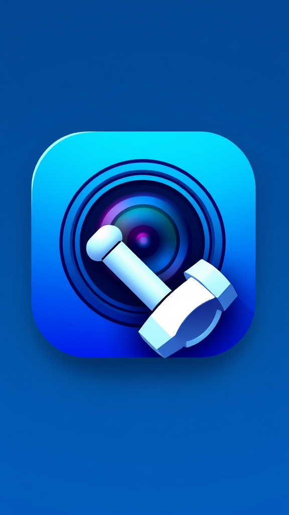 A sleek and modern app icon featuring a stylized blue camera lens intertwined with a minimalist dumbbell, set against a gradient blue background, symbolizing the fusion of photography and fitness.