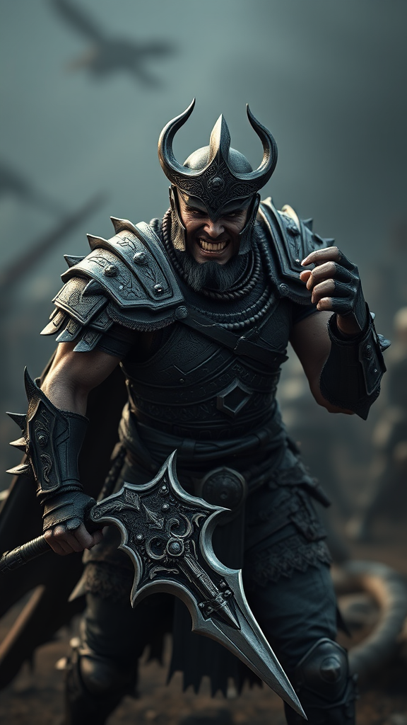 brutal warrior with an evil grin, wearing detailed armor and wielding an ornate weapon in dark, muted tones; battlefield scene as backdrop, posing militantly; epic composition with dramatic shadows; trending on artstation; suitable for wallpaper, rendered in 3D with cinematic lighting using octane and blender, 8k resolution, capturing an isometric view with VFX enhancements --no closeup portrait --s 1000 --ar 2:3 --q 2