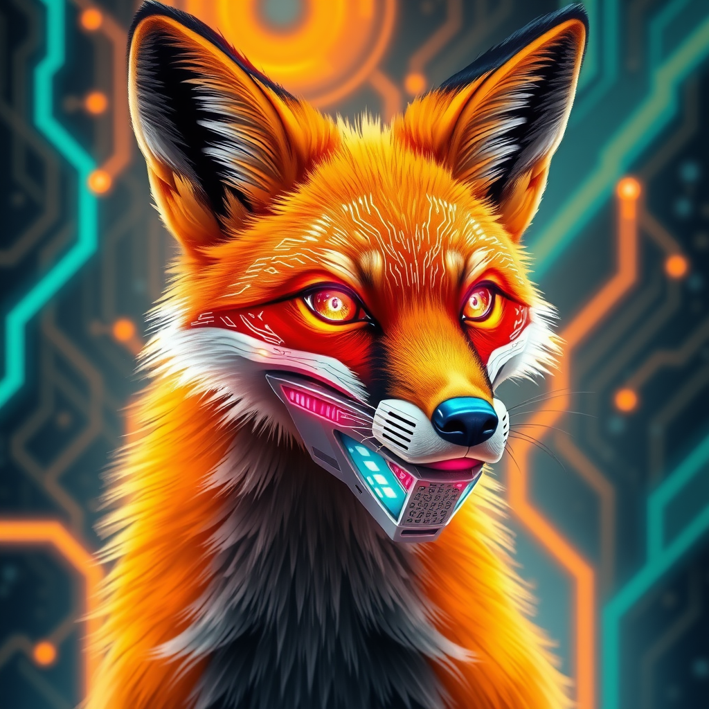 A vibrant digital fox with luminous orange fur, its eyes gleaming with intelligence and curiosity, adorned with intricate cybernetic patterns. The fox wears a sleek, futuristic mask over its mouth, seamlessly integrated into its sleek design, adding a mysterious aura. It stands against a backdrop of stylized circuits and glowing data streams, creating a mesmerizing fusion of nature and technology. The fox's ears perk up attentively, hinting at a world where digital landscapes and wild instincts coexist harmoniously.