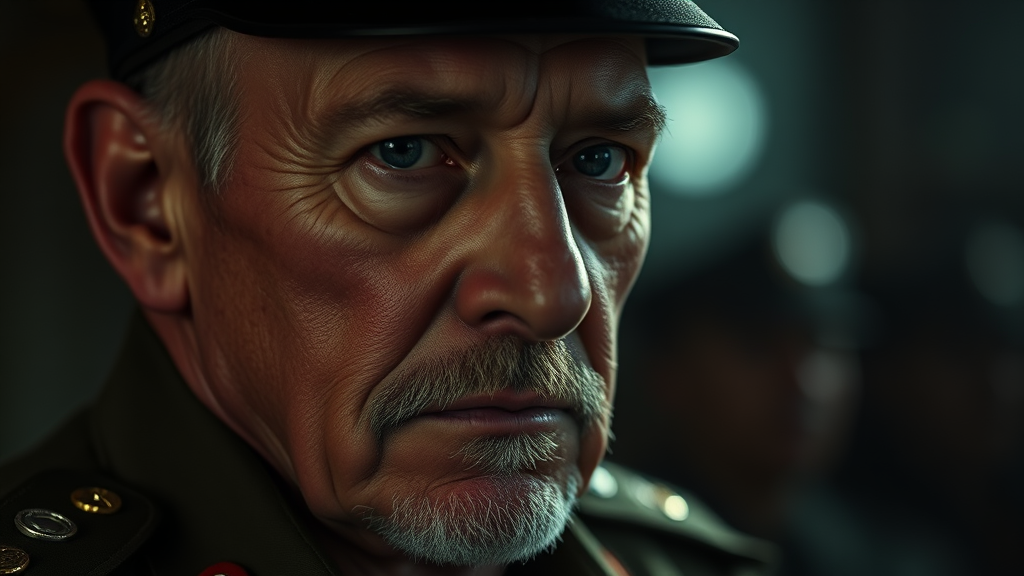 Close-up portrait of a 62-year-old stoic and decorated general, clean-shaven with a serious expression. Captured in a 4k epic detailed photograph, the image is shot on Kodak film, featuring a rich cinematic bokeh that adds depth. The setting is dark and moody, reminiscent of an HBO drama, highlighting the general's toughness and resilience.