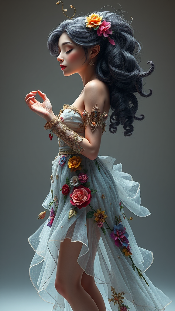 Hyper detailed full body portrait of an expressive woman in a captivating and whimsical dress, engaging in playful flirtation, creative character design, intricate and colorful, with stylized anatomy, high-quality digital art, incorporating Adobe Photoshop, 3D Studio Max, and V-Ray for a fantastical and unique creation, award-winning quality, set against a minimalist background, maintaining an artistic yet imaginative style.