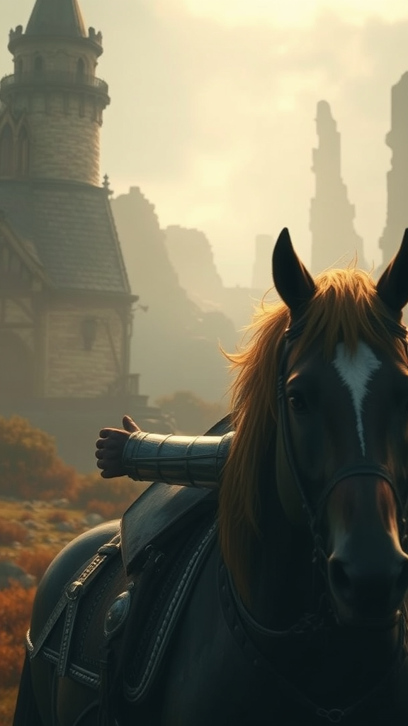 A lone, wandering knight traverses a mystical medieval landscape, crafted in exquisite digital art with intricate details that evoke a true masterpiece. The setting is reminiscent of an expansive RPG world, capturing a rugged hero clad in full armor. The knight’s figure is illuminated by cinematic lighting, casting dramatic shadows and emphasizing the rich ambiance of the medieval era. Despite an air of mystery surrounding his visor-covered face, a sense of resolve is evident. Subtle mutations hint at the fantastical, with duplicated yet strangely compelling eyes peering through the helmet. His hands, adorned with variations of extra fingers and unusual formation, lend an otherworldly charm to his twilight presence. Accompanied by a powerful horse, the knight moves with purpose through a low-resolution, artifact-strewn realm that shimmers with layers of history, tales untold, and a hint of the uncanny.