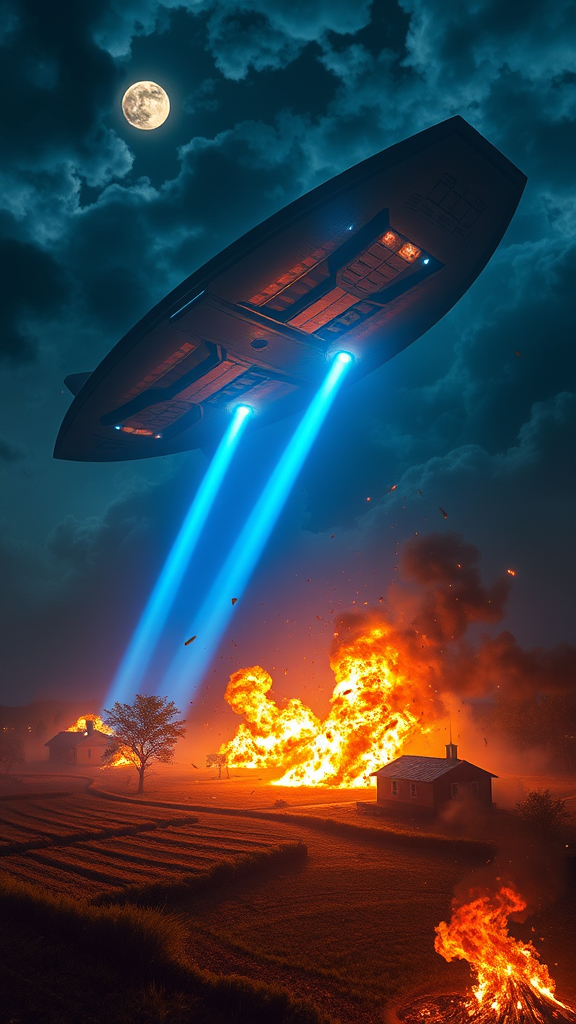 In the midst of a dark and cloudy night, a colossal spaceship looms ominously over a secluded farm, its sleek metallic surface reflecting the faint glimmers of moonlight. Suddenly, a vibrant blue beam shoots down from the ship, igniting the fields and structures below in a spectacular eruption of light and energy. Debris spirals and tumbles through the air as flames cast flickering shadows across the landscape, turning the night into a surreal tapestry of chaos and destruction. The scene is a breathtaking interplay of sci-fi grandeur and fiery devastation, the spaceship a silent architect of the farm's obliteration amidst the swirling clouds.