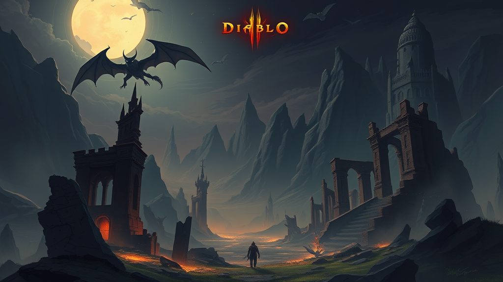 Illustration cartoon with rich dark colors and soothing tones, epic and realistic, inspired by a Diablo 4 wallpaper, depicting a hauntingly beautiful landscape with mystical creatures and ancient ruins, capturing a sense of adventure and mystery.