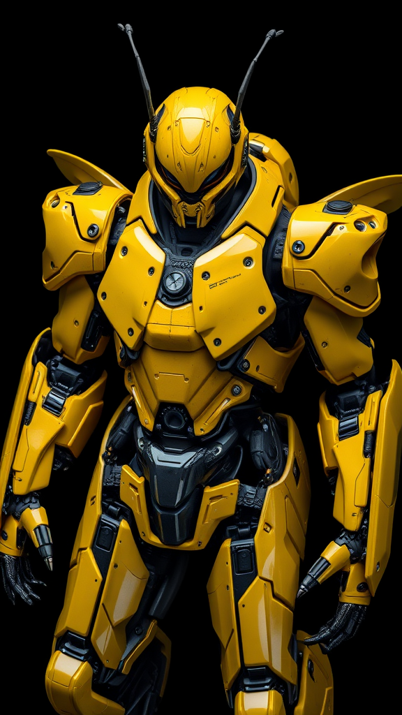 A sleek, black and yellow battle mech featuring intricate details and a sci-fi mask, highlighted by reflective yellow bodywork with a powerful jetpack. This insectoid-inspired combat mech boasts bright yellow polymer armor with unique identifying marks and finely crafted innards. Its surface features natural textures and reflections, set against a moody black background. The presentation is eerie and dramatic, captured with ultra-high resolution and photorealistic detail using Rembrandt lighting techniques. The composition conveys both creativity and precision, showcasing the mech in a hyper-realistic, top-down view with stunning cinematic quality.
