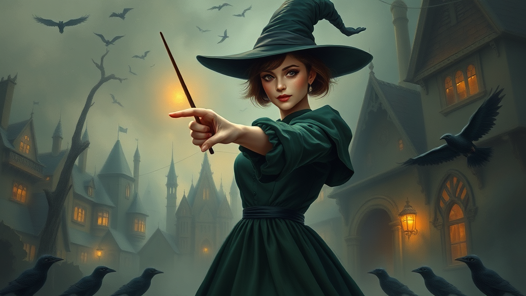 Full body portrait of the most powerful witch in the world, aiming wand, beautiful witch woman casting a spell, walking towards camera, short hair, mascara, reflective eyes, makeup, fog, cute nose, rim lighting, dramatic lighting, chiaroscuro, puffy sleeves, gothic Victorian town, crows, professional majestic impressionism oil painting by Waterhouse, John Constable, Ed Blinkey, Atey Ghailan, Jeremy Mann, Greg Manchess, Antonio Moro, trending on ArtStation, trending on CGSociety, intricate, high detail, dramatic, makoto shinkai kyoto, trending on artstation, trending on CGsociety, green dress, canvas frame, cartoon, 3d, strange colors, artistic expressions, mysterious atmosphere, ethereal presence, enchanting aura, imaginative landscape, captivating composition.