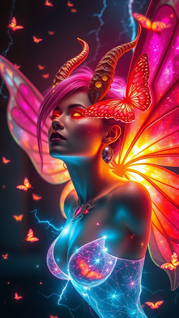 Sanctuary temple enveloped in an aura of dark magic; a mesmerizing devil fairy with a devil soul and a hint of jinn and demon heritage. Her divine, pristine skin glows under the particles of multicolored lightning. Her translucent, glass-like fairy wings shimmer with neon hues, matching her vibrant, glowing eyes and vivid, multi-color hair. Full makeup accentuates her features, and a swirling energy surrounds her, adding depth to the scene. Lighting butterflies flutter around her in this dark fantasy setting. She levitates effortlessly, her head tilted skyward, capturing a masterpiece with perfect anatomy. Shot in 32k UHD resolution, the image showcases best-quality, high-resolution realism with professional photography techniques. A cinematic angle and lights bring out brilliant, vibrant colors with highest detail. The composition is stunningly hyper-emotional, as if crafted by DAZ3D, provided in RAW format from a wide-angle shot.