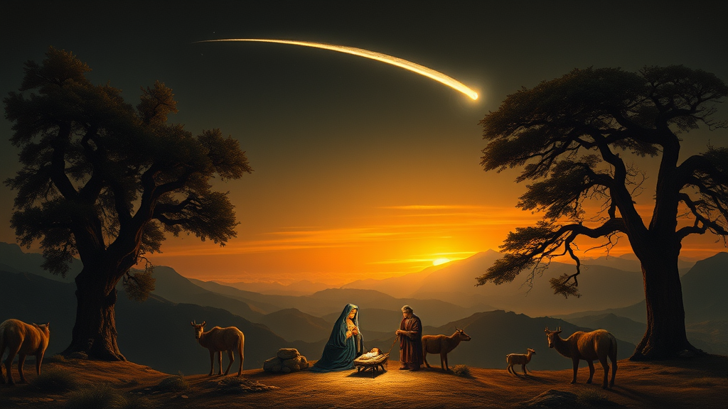 In a breathtaking fusion of Caspar David Friedrich's renowned landscape style and a nativity scene, the composition presents a serene Orient setting where the last, golden rays of sunset cast a gentle glow upon softly undulating mountains. The darkening sky is illuminated by the brilliance of a comet, its tail an ethereal arch over the tranquil vista. Tall, ancient trees stand solemnly on either side, framing the scene with their gnarled branches. In the foreground, the figures of the nativity—Mary, Joseph, and the infant Jesus—are depicted with a sense of awe and reverence, bathed in the celestial light. Surrounding them, humble shepherds and serene animals add to the sense of quiet majesty, creating a tableau that blends Friedrich's atmospheric depth with the timeless story of hope and renewal.
