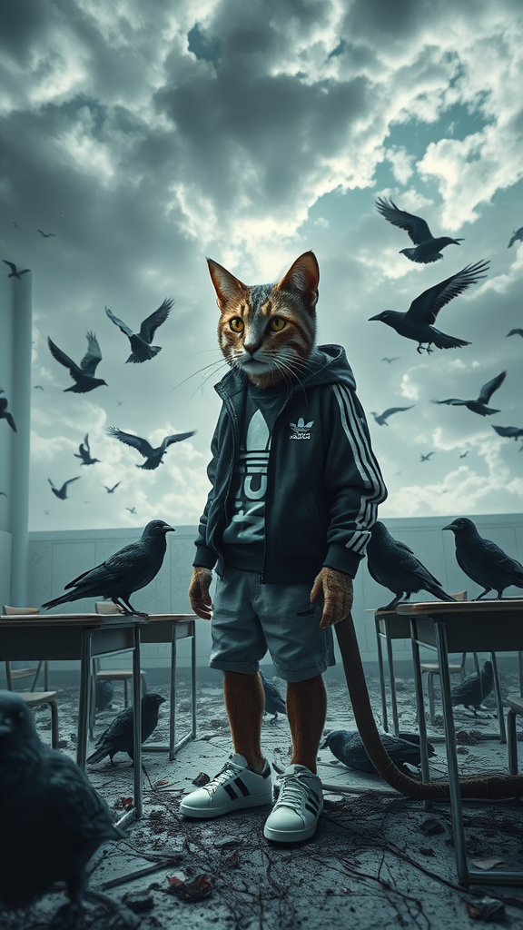 Supper realism, anthropomorphic cybernetic feline in a stylish Adidas jacket and sneakers, surrounded by curious crows, amidst the chaos of a damaged classroom with scattered tables and chairs. A stunning sky looms above, casting an eerie and ominous glow. The atmosphere is a blend of horror and intrigue, with gray and green tones creating a haunting fantasy landscape. The composition follows the golden ratio, presented in an ultrawide, hyper-detailed, cinematic, and hyper-maximalist style, merging elements of beauty and unease.
