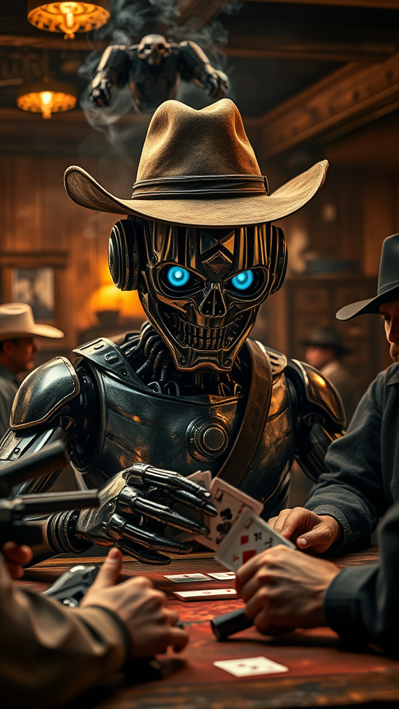 A hyper-detailed portrait of a futuristic robot wearing a weathered cowboy hat, engaged in a tense poker game under the warm, dim lighting of a classic western saloon. The scene is bustling with rugged cowboys, revolvers resting casually in holsters, and a haze of cigar smoke swirling overhead. The robot's metallic fingers expertly handle a deck of cards, its eyes, a glowing blue, give away no emotions as it sizes up its human opponents. Captured in RAW with an 8k UHD resolution using a high-quality Fujifilm XT3 DSLR, the image boasts intricate textures and vivid colors, highlighting the contrast between the saloon's rustic wood interior and the robot's sleek, polished surface.
