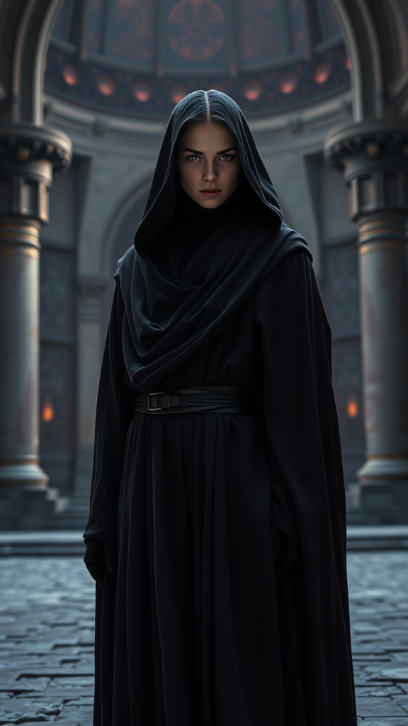 A lone female figure, donned in dark, flowing robes, stands against the majestic backdrop of a Star Wars temple, her eyes symmetrically aligned and filled with intensity. The scene is brought to life with dramatic and moody lighting, accentuating every hyper-realistic detail through sharp focus and intricate textures. This photographic portrayal embodies the essence of a Sith Lord, incorporating physics-based rendering techniques for a cinematic feel akin to a high-definition poster. Captured through a 70mm lens, the image boasts extreme detail, beautifully color-graded elements, and dynamic depth of field. Expertly lit with a combination of natural and studio lighting, the environment features volumetric effects and rich optical details like ray tracing reflections and global illumination. Shadows play across the robe’s intricate fabric, highlighted by elegant post-processing techniques such as chromatic aberration and tone mapping. Composed as an ultra-detailed piece of digital art, the scene radiates with a timeless presence, inviting viewers into its richly rendered universe.