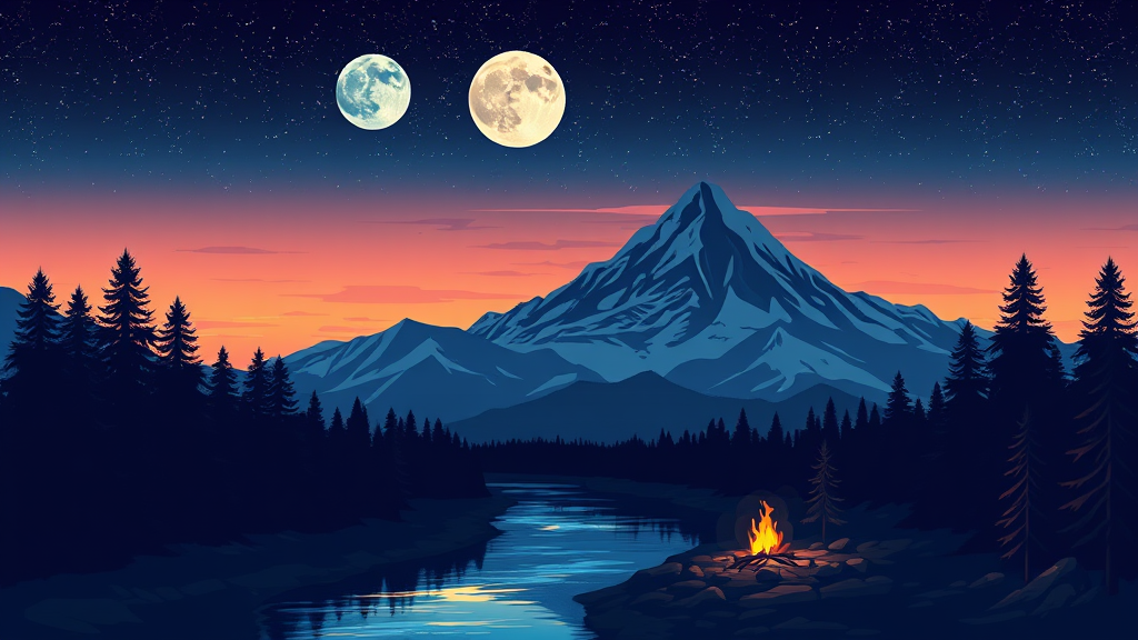 Ultra-detailed mountain vector art featuring a stunning night scene with two moons casting a dreamy glow. The sky is a masterpiece of vibrant colors and intricate details, complemented by a serene river reflecting the moonlight. Detailed pine trees line the riverside, while a small campfire adds a warm touch, its light dancing on the water's surface. This 2D vector illustration combines modern and minimalist design elements with flat colors for a sophisticated look. The composition is reminiscent of a Behance contest winner, showcasing professional work that trends on Dribbble and Shutterstock. Additional motifs like imprint, monogram, and emblem subtly integrate into the design, enhancing its branding appeal. The scene captures the essence of digital art, with typography elements subtly woven into the landscape, creating a harmonious blend of nature and design. A truly exceptional piece, this artwork exemplifies vibrant creativity and artistic excellence.