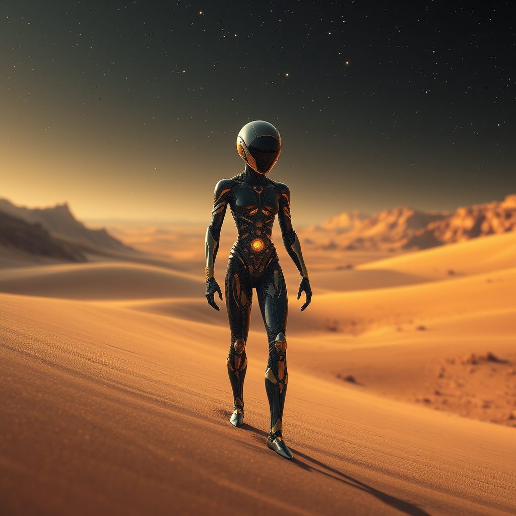 Interstellar entity in arid landscape art hd, reflecting futuristic elegance, dark sand tones and glistening gold hues, shallow focus with solarpunk influences, imaginative postures, vast celestial horizons, mesmerizing.