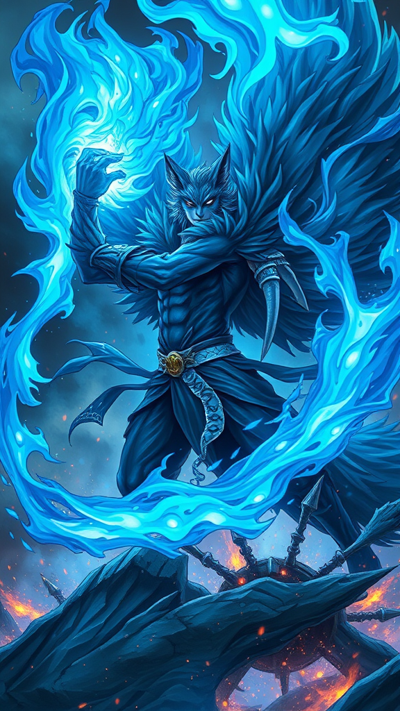 Majestic dark fox wielding intense azure flames of energy, anime-style, in 8K resolution. A sorcerer humanoid male prince of shadows triumphs on the battlefield amidst swirling blue inferno and sparks. Apocalyptic backdrop, vibrant, intricate, and elegantly detailed digital illustration. Scenic and hyper-detailed, capturing the essence of an epic thunderstorm.