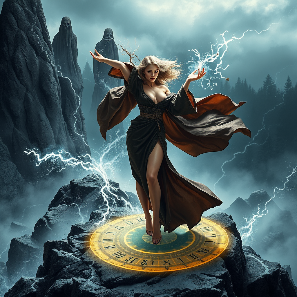 A stunning pinup model with shiny skin and soft lighting stands atop a windy mountain peak clad in a flowing wizard robe. The stormy backdrop enhances her presence as she casts an enchanting spell. Swirling water encircles her, while electricity sparks dance around her form and spread across the rocky ground. Massive rock pillars emerge from the earth, accentuated by powerful winds that stir leaves into a frenzy. A radiant magical circle glows beneath her feet, illuminating ancient runes. Ominous shadowy figures lurk in the background amid a dark forest. Her pose is graceful, though subtly imperfect, adding an air of fantastical realism as she embodies the essence of a formidable fantasy wizard.