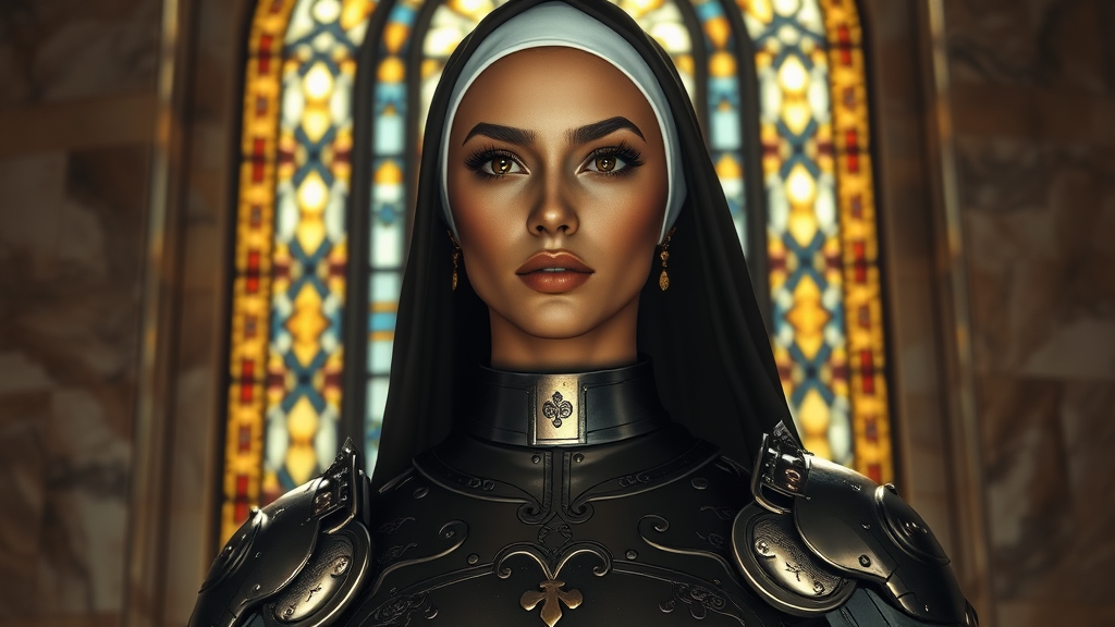 A captivating full-body portrait in a Modelshoot Style captures the essence of the most stunning woman, a Sister of Battle adorned in sci-fi nun attire standing before a grand stained glass window. Her tanned skin and striking fleur de lys face tattoo are complemented by detailed symmetrical features, including long eyelashes, dark eyebrows, and subtly applied makeup. The armor she wears is embellished with wax seals, reflecting light in a way that highlights dust particles in the air. The scene is a masterpiece of dramatic chiaroscuro lighting and intricate detail, reminiscent of an impressionistic oil painting by masters such as Waterhouse, John Constable, and reminiscent of Studio Ghibli's enchantment. The backdrop features majestic marble walls, giving the composition a professional and majestic feel. The image trends on ArtStation and CGSociety for its high detail and dramatic flair, akin to the works of Jeremy Mann and Greg Manchess. There's a subtle influence of Makoto Shinkai's Kyoto inspiration, creating an intricate and captivating visual experience.