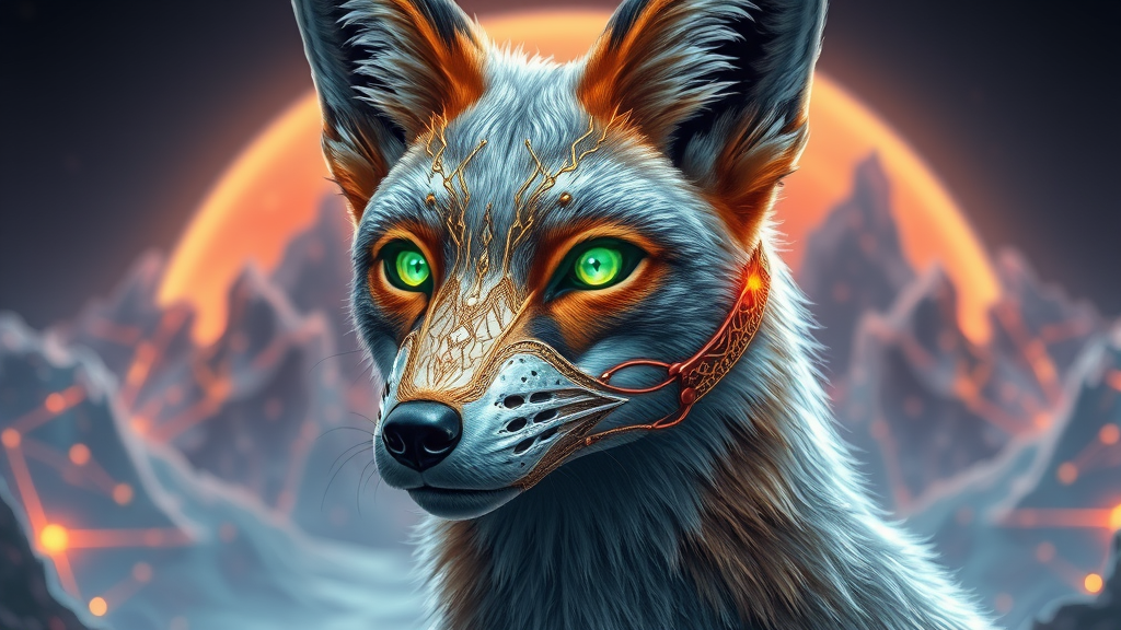 A striking depiction of a virtual fox with luminous, emerald-green eyes, its sleek fur shimmering with hues of silver and amber. The fox is adorned with an intricately designed mask, woven with delicate gold threads and subtle digital circuitry patterns, covering its muzzle. In the background, an abstract digital landscape echoes the fox's enigmatic aura, blending elements of the natural world with futuristic, neon-lit elements. The scene conveys a sense of mystery and intelligence, capturing the essence of this digitally-inspired creature.