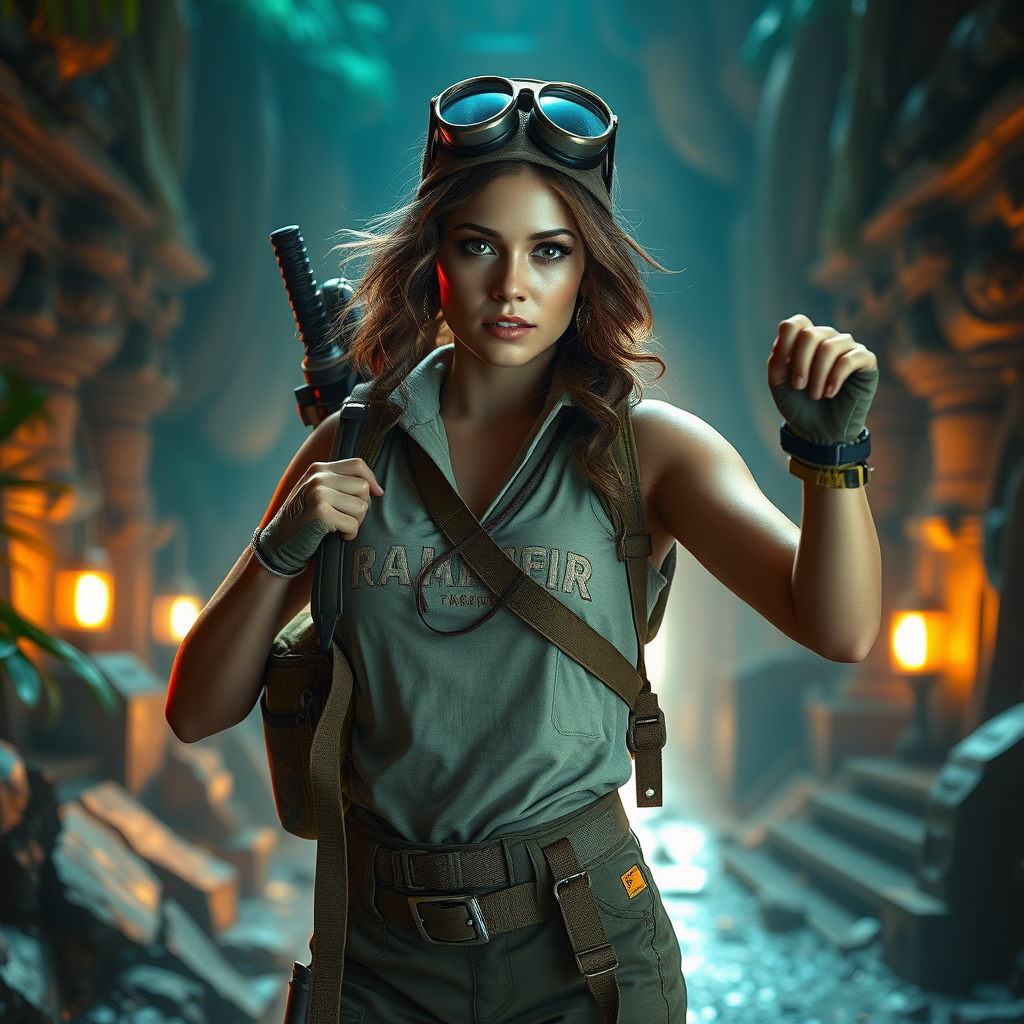Full body portrait of a stunning woman reminiscent of Jessica Alba as an adventurous archaeologist, equipped with signature gear and poised in a dynamic, action-ready stance. The scene is captured in 8k ultra-realistic detail with exquisite lighting that highlights the intricate textures of her outfit and gear. A glowing atmosphere with subtle lens flare accents the vivid, full-color cinematic setting resembling a lush, mysterious jungle temple. This image, resembling a masterpiece trending on ArtStation, is created with the advanced capabilities of Unreal Engine 5, featuring hyperrealism in CGI and exceptional 3D rendering. The environment is breathtaking, with Lumen reflections casting realistic shadows. The portrayal hints at hyperrealistic perfection, reminiscent of high-tier photography, with the character's features and pose perfectly aligned, avoiding any anatomical inaccuracies.