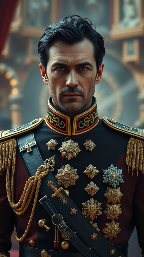 A stunning portrayal of Paul Atreides in an elegant, ornate royal military uniform, exuding a sense of realism and detail. The scene is set in a sci-fi universe with a focus on UHD, HDR, and 8K quality, captured with the vibrancy of the Dark Sushi Mix - Colorful model. Paul is depicted with exquisite detail, showcasing a lifelike expression and posture. The composition avoids any anomalies such as cloning, disfigurement, or mutations. The visual remains crisp, fully in-frame, devoid of any blurriness or technical artifacts like watermarks or logos. The imagery is seamlessly realistic, avoiding cartoonish elements, ensuring an immersive and captivating representation of Paul Atreides.