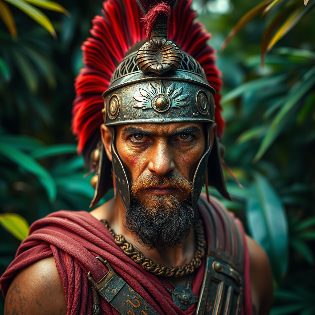 Hyper-realistic portrait of a battle-worn hoplite with a somber expression standing in a vibrant, dense rainforest, showcasing vivid and dynamic colors. Taken with a Nikon D850 using an 85mm lens at f/1.8, the image features intense contrast and rich hues, with a shallow depth of field that blurs the lush background. The scene evokes a sense of raw, emotional intensity, maintaining a square aspect ratio and a cinematic, unfiltered style.