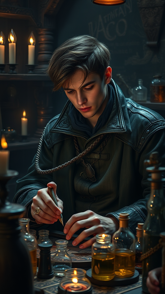 A young male alchemist in a dark medieval lab meticulously works on potions, surrounded by an array of intricate tools and vials. His detailed robe is accented with leather, exuding an atmosphere of dark fantasy. The scene is hyper-realistic, capturing the essence of his focused demeanor, but plays on the edge of surrealism with odd proportions and peculiar details like unusual hands and a slightly blurred face. The atmosphere is mysterious and otherworldly, with shadows cast by flickering candlelight highlighting the complexity of his work without venturing into low quality or morbid imagery. The scene captures a juxtaposition of skill and imperfection, in a captivating, fantastical setting.