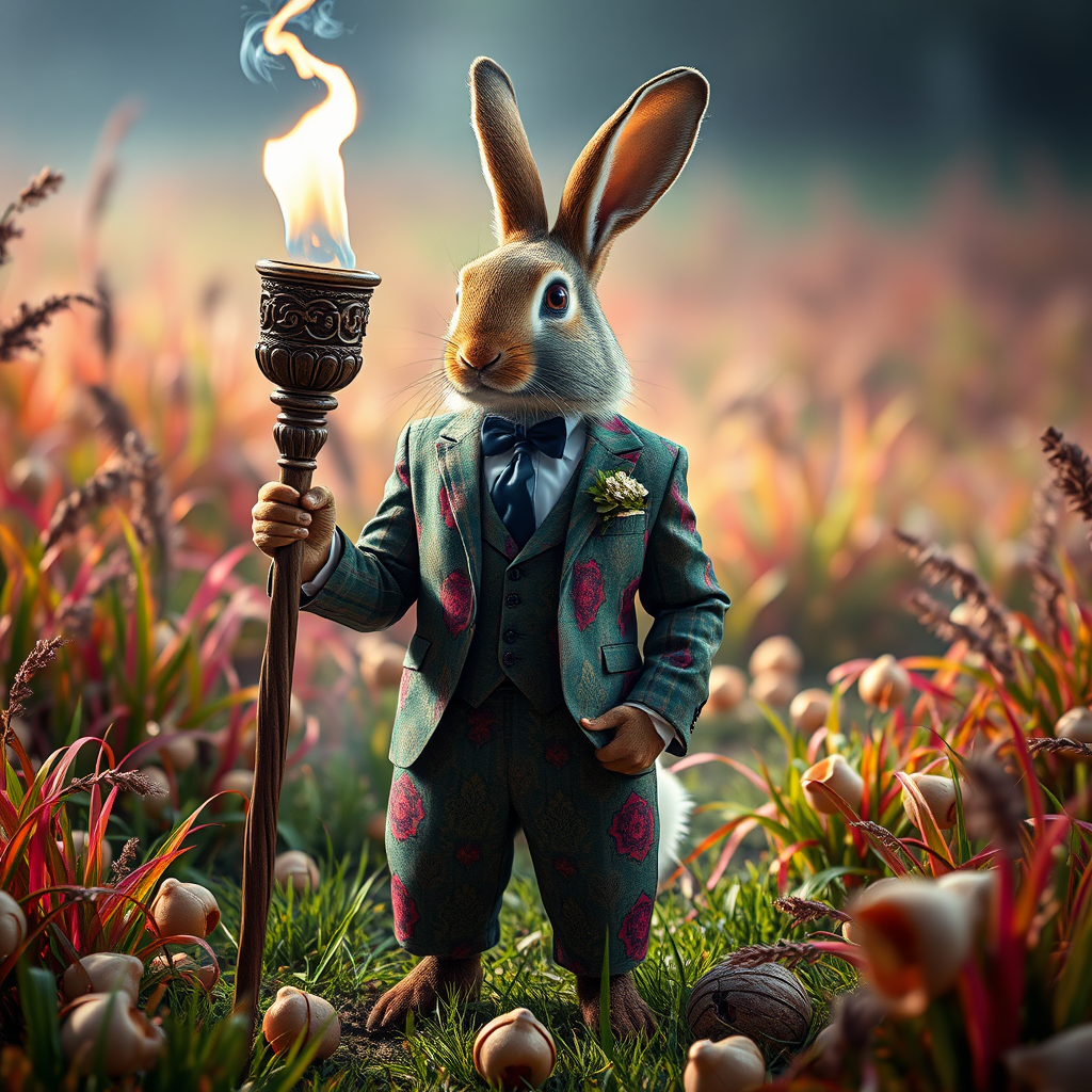 A full-body portrait of a sophisticated Martinican rabbit adorned in an elegant madras suit, exuding a regal persona, holding a wooden torch with intricate carvings. Set in a fantastical realm of multicolored grass and scattered conches, the scene is lit with dramatic, cinematic lighting. The rabbit, with a humanoid form, stands amidst this vibrant landscape, embodying both realism and fantasy in an epic composition that captures every meticulous detail.