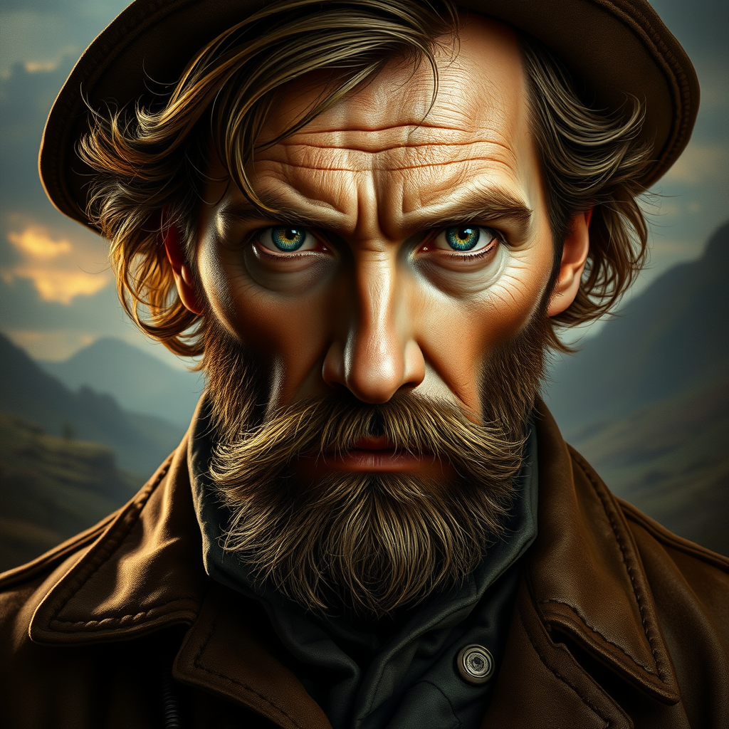 Portrait of a rugged 19th-century man with pronounced mutton chops, wearing a weathered leather jacket, capturing the essence of Victorian era. His face is intricately detailed, exuding a sense of wisdom and adventure, against a backdrop of mystic landscapes. The artwork reflects a fantasy narrative with a focus on the man's piercing eyes and strong jawline, illuminated by dramatic, cinematic lighting. This digital art piece is inspired by the style of Greg Rutkowski, emphasizing a richly textured, highly detailed close-up that portrays the character as a seasoned voyager from a fantastical realm.