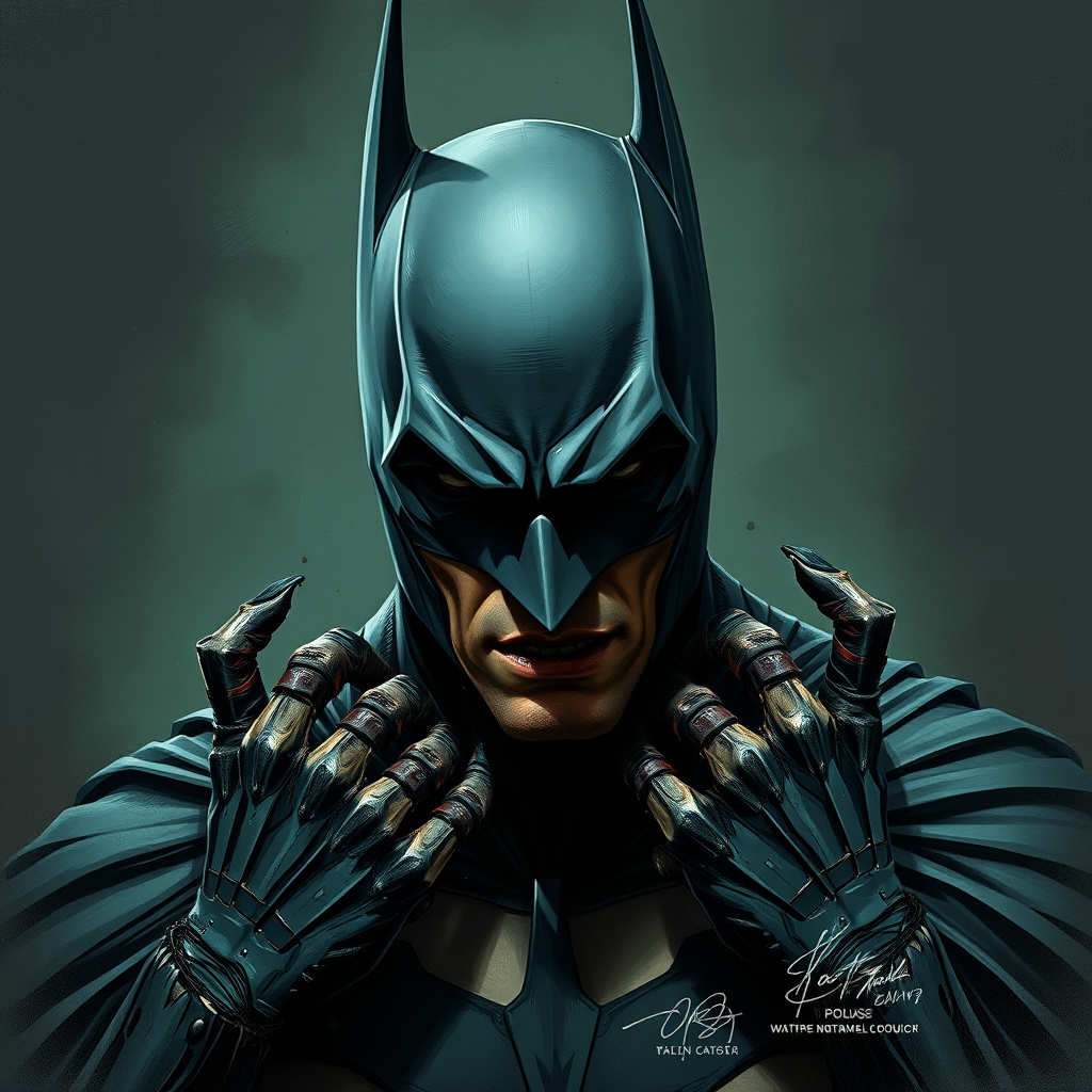 Digital wallpaper portrait of Batman, the Dark Knight, in a comic-inspired style, 8k resolution, with a rough aesthetic that echoes Marvel Comics style. The scene is set against a dark background with muted colors, emphasizing an epic and dramatic composition. The digital painting is emotionally profound and intricate, capturing a sense of desperation. The image conveys imperfections, with low image quality, visible jpeg artifacts, and an intentionally rough look. Batman's features are depicted with exaggerated and distorted elements, including poorly drawn hands and face, conveying a sense of mutation and deformation. The proportions are intentionally off, with attributes such as a long neck, disfigured face, and extra limbs that add to the morbid and malformed appearance. The image avoids polished perfection, featuring elements like cut-off features, blurred segments, and hints of camera interference. Signatures, watermarks, and logos are subtly integrated into the composition as part of the chaotic visual narrative.