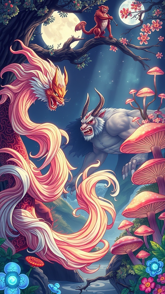 A highly detailed, anime-style illustration captures a mystical scene featuring an enchanting kitsuné with nine flowing tails, each shimmering with a unique gradient of colors. Nearby, an imposing Oni stands with a fierce yet wise expression, its muscular form adorned with intricate tribal patterns. A Nué lurks in the background, its composite form blending a monkey's face, tiger's limbs, and a serpent's tail, emanating an air of ancient mystery. Above them all, a Tengu with majestic wings perches on a tree branch, its cunning eyes surveying the landscape below. The setting is adorned with vibrant, fungi-inspired decor that includes oversized, fantastically colored mushrooms and whimsical bioluminescent flora, creating an otherworldly ambiance. Soft rays of moonlight filter through the scene, highlighting the intricate details and bringing the mythical creatures to life, all captured in stunning 2K resolution.
