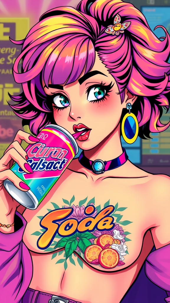 A vibrant woman with a colorful chest tattoo sips from a vivid, soda-themed drink can, embodying a mix of candypunk and 80s anime aesthetics. Her style, reminiscent of classic 80s and 90s anime art, features bold lines and bright, neon colors. Her hair is styled in an exaggerated, puffy manner, cascading around her animated expression. Dressed in a playful, retro-futuristic outfit, she radiates an energetic, nostalgic vibe, as her eyes widen with the fizzy delight of her preferred energy drink. The scene captures the essence of a dynamic, anime-styled character full of life and vibrant energy.