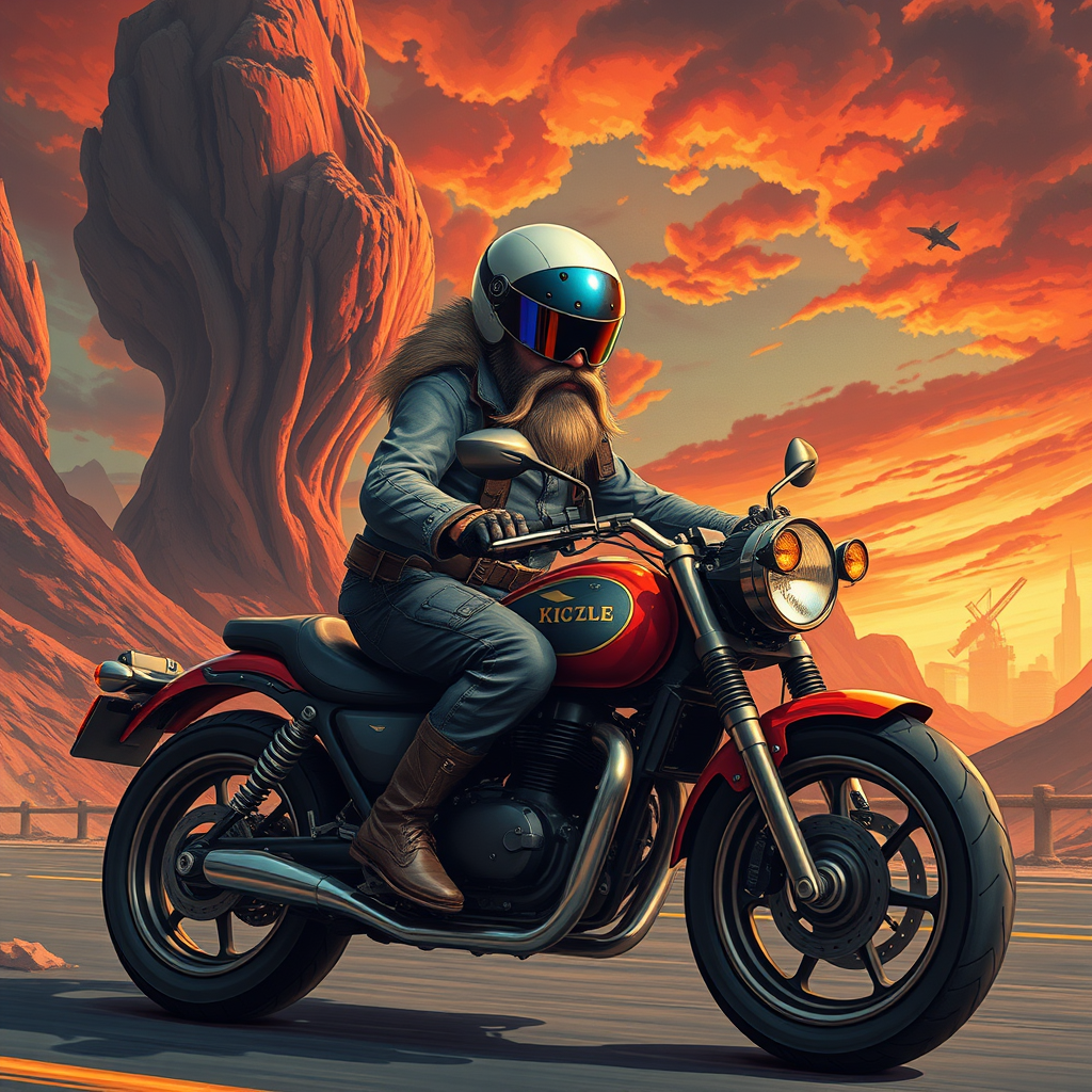 An innovative game developer unveils an advanced VR MMORPG where the universe evolves autonomously, driven by artificial intelligence, mimicking the real world's pace but accelerated. The game's popularity skyrockets due to its lifelike NPCs, which begin to exhibit genuine autonomous behavior, turning the game into a vibrant alternate universe. Within this world, a biker with a uniquely sculpted helmet and intricately detailed motorbike navigates the dynamic landscapes. Sporting a distinctive long beard and wearing pointed footwear, the character becomes iconic. Surreal artistic elements intertwine, as the NPCs display unusual traits like two navels or strangely fused fingers, adding to the mesmerizing yet unsettling realism. The game blends vivid color with moments of black-and-white nostalgia, creating a visually captivating experience that transcends conventional gaming bounds.