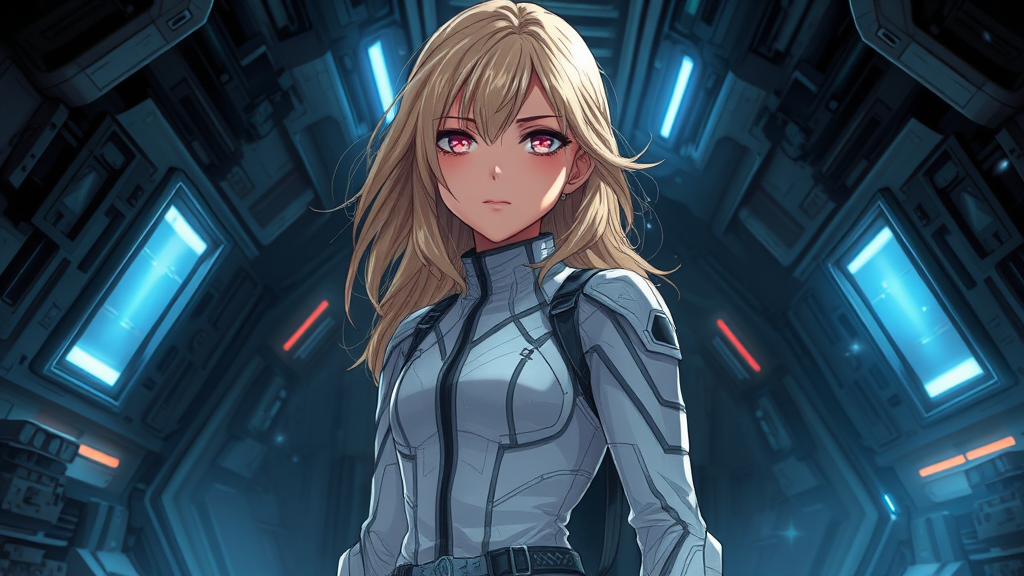 Anime-inspired art featuring a young girl in a form-fitting white sci-fi jumpsuit, reminiscent of Tsutomu Nihei's style, set in a futuristic cyberpunk environment. She has loose, long, natural blonde hair that adds a sense of movement against a dramatic, dark background. The setting is the interior of a sci-fi spaceship, with intricate details and sharp angles throughout. Her facial features are beautiful yet convey a cold, distant look, fitting the gloomy and chilling atmosphere of the room. The scene is rendered with muted colors, accented by a soft blue light and a brighter, piercing light from one direction. The space is multi-level, with sharp shadows and a subtly blurred background to suggest depth. The style is distinctly futuristic, with hyper-detailed elements, flashes of light, and clumps of energy adding to the immersive atmosphere. The perspective captures her in a third-person portrait view, maintaining a focus on the blend of anime and manga graphics.
