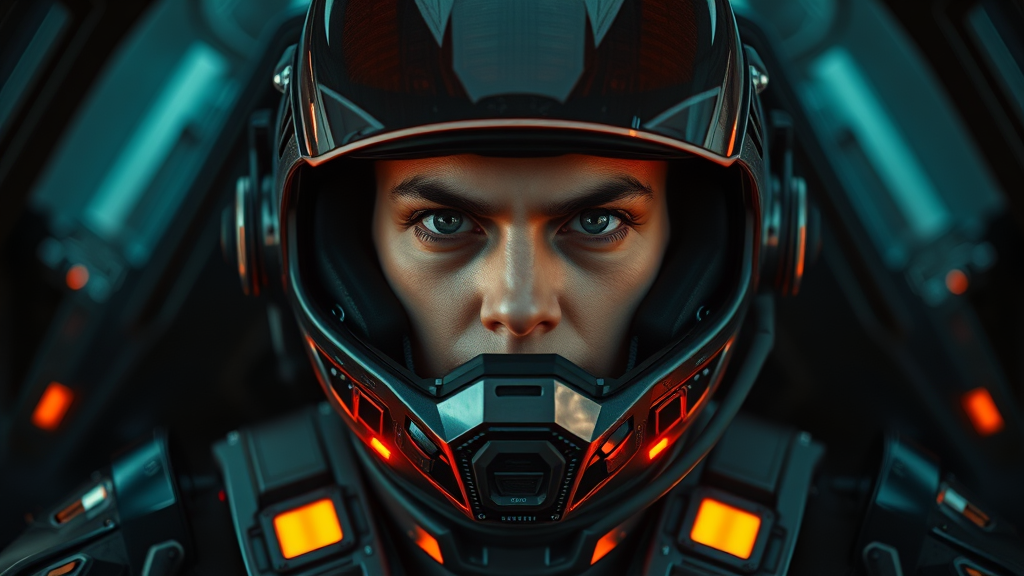 A hyperrealistic and intricately detailed portrait of a pilot wearing a futuristic, fully encompassing helmet, seated in a high-tech cockpit. The pilot dons sci-fi armor that glimmers with bioluminescent elements. They gaze directly at the viewer, centered in the frame, exuding a cyberpunk aesthetic. The scene is captured with cinematic precision, featuring a sharp focus and striking depth of field, enhanced by dramatic and immersive lighting.