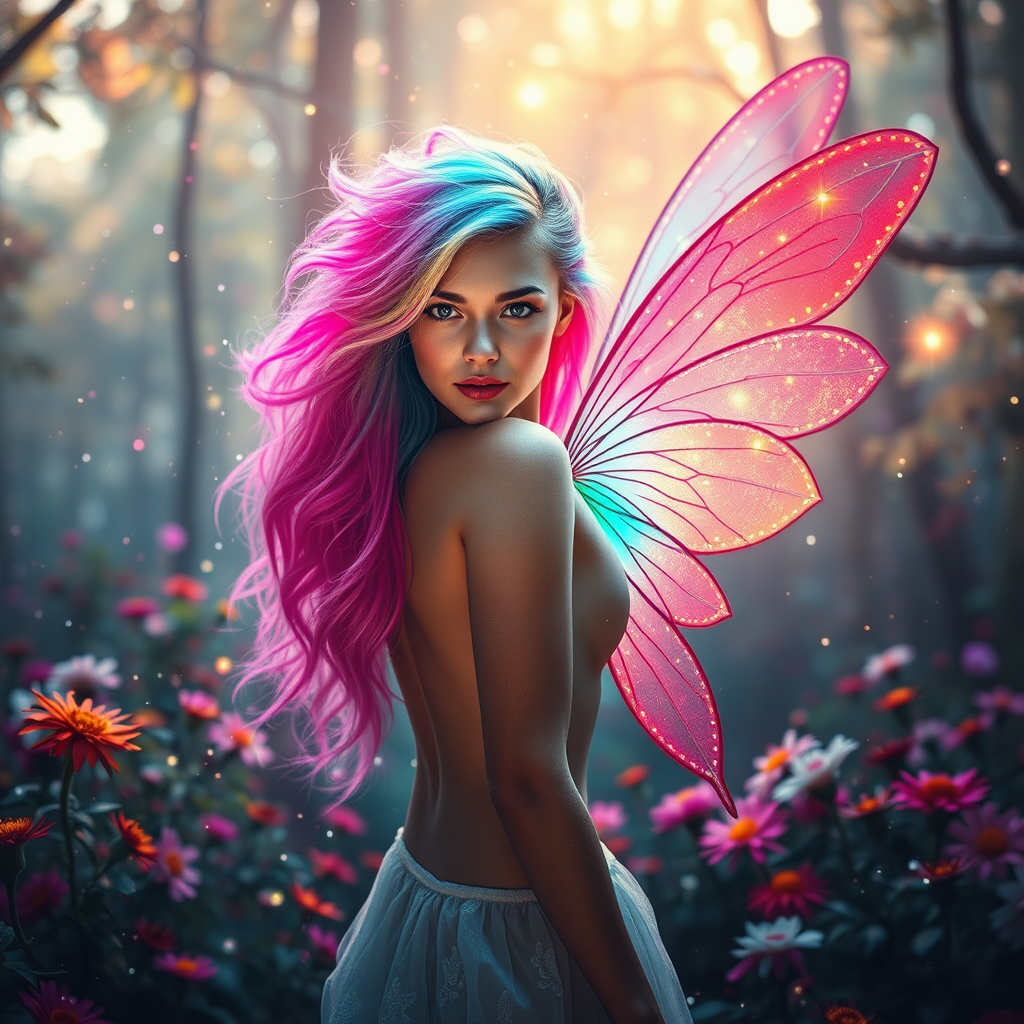 In a mystical forest alive with vibrant flora, a chronomancer—an enigmatic time-manipulating mage—stands amidst a shower of light particles. Their flawless skin glows beneath a mane of neon-hued hair that shimmers with every color imaginable. Fairy wings, resplendent in a kaleidoscope of colors, flutter gently behind them. Soft, fractal energy particles dance in the air, creating a mesmerizing scene rich with detail and depth. The ambient beauty echoes the essence of a "Breath of the Wild," with an abundance of flowers painting the landscape. Capturing a cinematic moment, the mage's whole body is portrayed from afar yet engages the viewer with their gaze. The scene, shot with a cowboy angle, balances professional lighting with a vivid, vibrant color palette. Every element is a masterwork of realism and precision, rendered in a stunning 32k UHD resolution for the highest quality photograph, focusing on perfect anatomy and extraordinary detail.