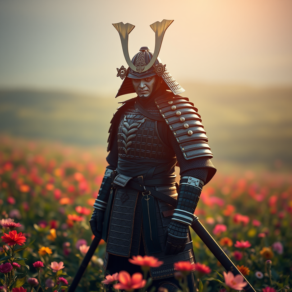 Samurai in intricate full armor with a katana, standing proudly on a verdant plain surrounded by vibrant flowers under cinematic lighting. Rendered using Unreal Engine 5, this editorial-style photograph captures the samurai through a 70mm lens with a shallow depth of field and dynamic tilt blur. Shot at 1/1000 shutter speed and f/22 aperture, the white balance set to 32k ensures a hyper-realistic, super-resolution image in megamegapixel detail, utilizing ProPhoto RGB color space. The scene employs virtual reality technologies to present a tall, epic figure inspired by the styles of Artgerm and Alex Ross. Natural halfrear lighting blends with incandescent and optical fiber light to create moody, cinematic atmospheres, enhanced with soft studio lighting, contre-jour effects, and dramatic shadows. Utilizing state-of-the-art global illumination techniques, including ray tracing and screen space reflections, the image glows with a shimmering intensity. Sophisticated post-processing techniques like diffraction grading, chromatic aberration, and ray-traced ambient occlusion refine the scene. Advanced shaders and post-production enhance the intricacy, with elegant cel shading and tone mapping completing the hyper-realistic, detailed capture of a samurai in a dynamic, centered pose.