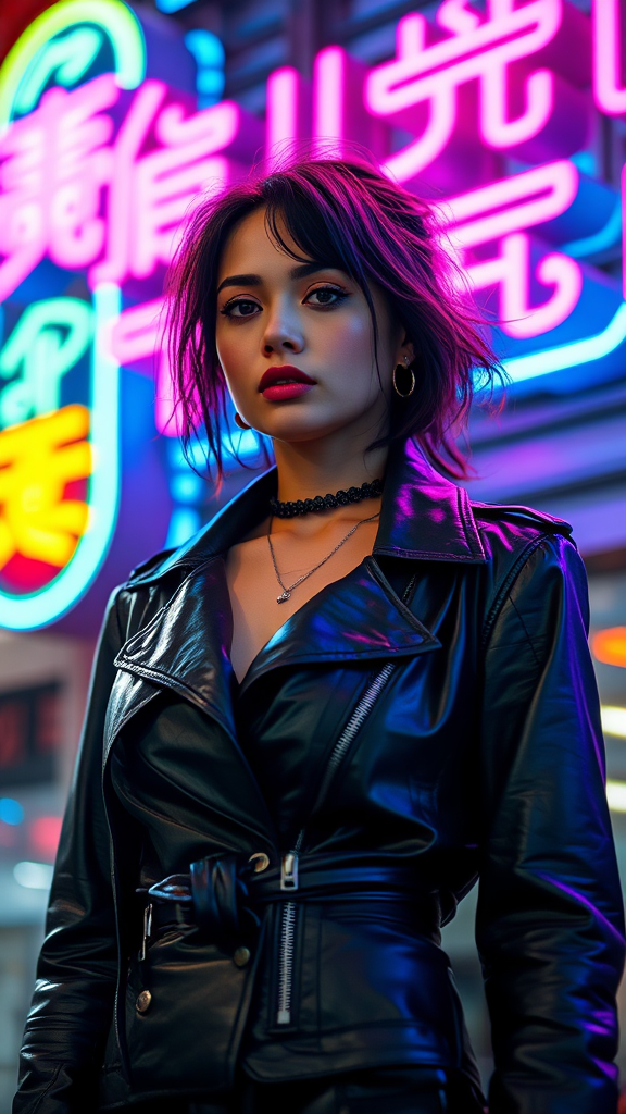A woman stands poised in front of a vibrant neon sign, enveloped in the hyper-realistic sci-fi world of steelpunk aesthetics. Her attire, a blend of leather and hide, reflects the gritty yet modern edge of her surroundings, reminiscent of a DC Comics heroine. Captured with the precision of a Sony Alpha A1, her candid aura is akin to renowned figures caught in unguarded moments. The scene exudes a motif of mote kei, with delicate, ethereal elements merging seamlessly with the urban fabric. The air buzzes with electric tension, casting colorful highlights across her determined expression.