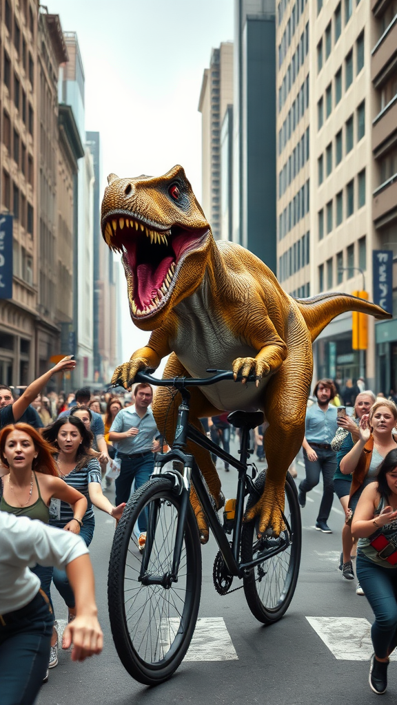 A lifelike Tyrannosaurus rex pedaling a bicycle with its powerful legs, its massive jaws open wide as if roaring triumphantly, while a crowd of terrified people races away, their faces marked by expressions of horror and disbelief, their clothing fluttering wildly as they navigate the chaos of the city street, bystanders snapping photos with smartphones, capturing the surreal and exhilarating scene.