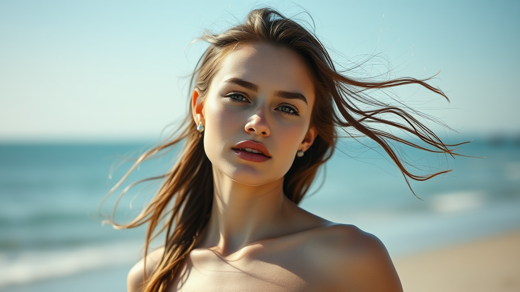 Professional portrait photograph of anyataylorjoy on the beach, ultra realistic, concept art, elegant, highly detailed, intricate, sharp focus, depth of field, soft natural lighting, 85mm focal length, medium shot, capturing her essence and grace, featuring a gentle breeze playing with her hair, trending on instagram, showcasing vibrant colors and serene ambiance, 4k resolution, captivating composition, highlighting her confident and serene demeanor, clear blue sky in background, enhancing the overall aesthetic, minimalist and timeless beauty.