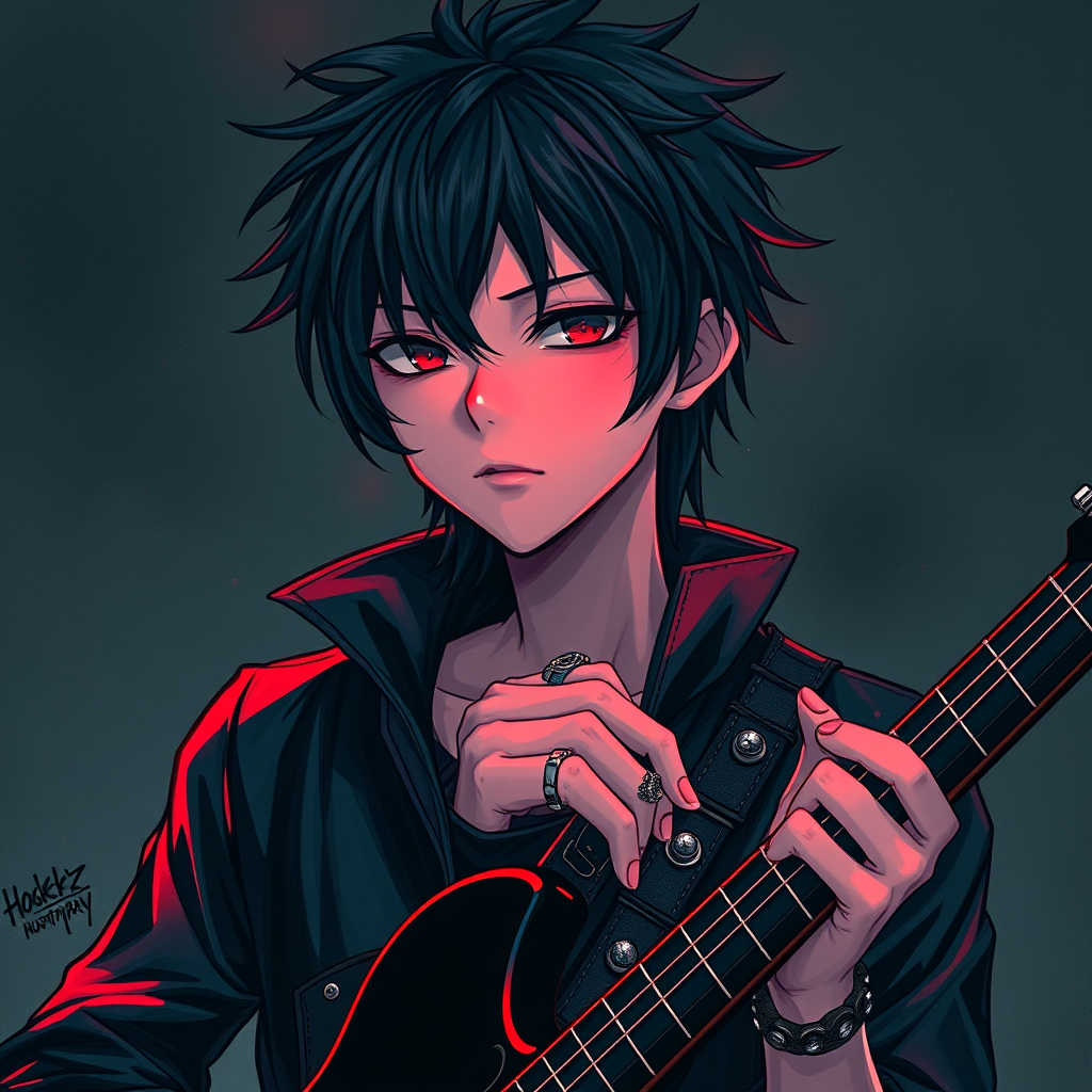 A mysterious and captivating portrait of a stoic anime boy with dark black hair, exuding a cool attitude as he holds a sleek guitar. Rock music influences are evident in edgy spikes and a punk-inspired wristband. The composition features elements reminiscent of Davinci's drawing style, with a focus on intricate details. The color palette highlights neon red contrasts against deep, intense blacks. The boy's enigmatic expression draws the viewer in, set against an atmospheric background that enhances the overall mood.