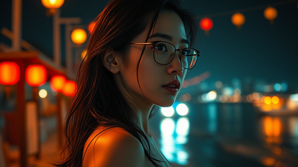 An Asian woman of 30 with an athletic build and a strikingly beautiful face, featuring a gentle and serene expression, stands elegantly. Her glasses catch the dim light as she gazes thoughtfully into the distance. Her hair flows with a mildly wet look, suggesting her presence on a nighttime beach. It's 11 p.m., and the setting is brought to life with a dramatic background filled with the cool, glowing atmosphere of lanterns and distant town lights. The cinematic capture, a photograph taken from a low angle with a wide-angle DSLR, achieves a hyper-photorealistic result. The camera settings are perfectly calibrated with an aperture of f/8, a shutter speed of 1/250 sec, and ISO 100. Backlit from the side, the scene highlights natural reflections and the anime-style cinematic glow. Textures and intricate details shine as the blinding bright light illuminates her and the environment. The overall composition maintains a sense of harmony and balance, emphasizing symmetry and elegance without straying into artificial or morbid territory. The portrayal evades deformities or inaccuracies, ensuring realistic anatomy and flawless proportions, capturing a moment of beauty and tranquility.