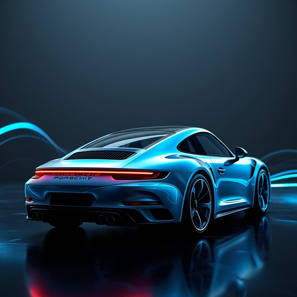 Backlit Porsche 911, featuring a sleek 3D abstract digital artwork in black, white, and electric blue tones; the design showcases fluid, sharp lines with depth of field and advanced shaders. Enhanced with RTX and CGI technology, the scene is illuminated by volumetric lighting and rendered using octane for a high-definition wallpaper effect. The overall aesthetic blends chaos and precision into a dynamic composition.