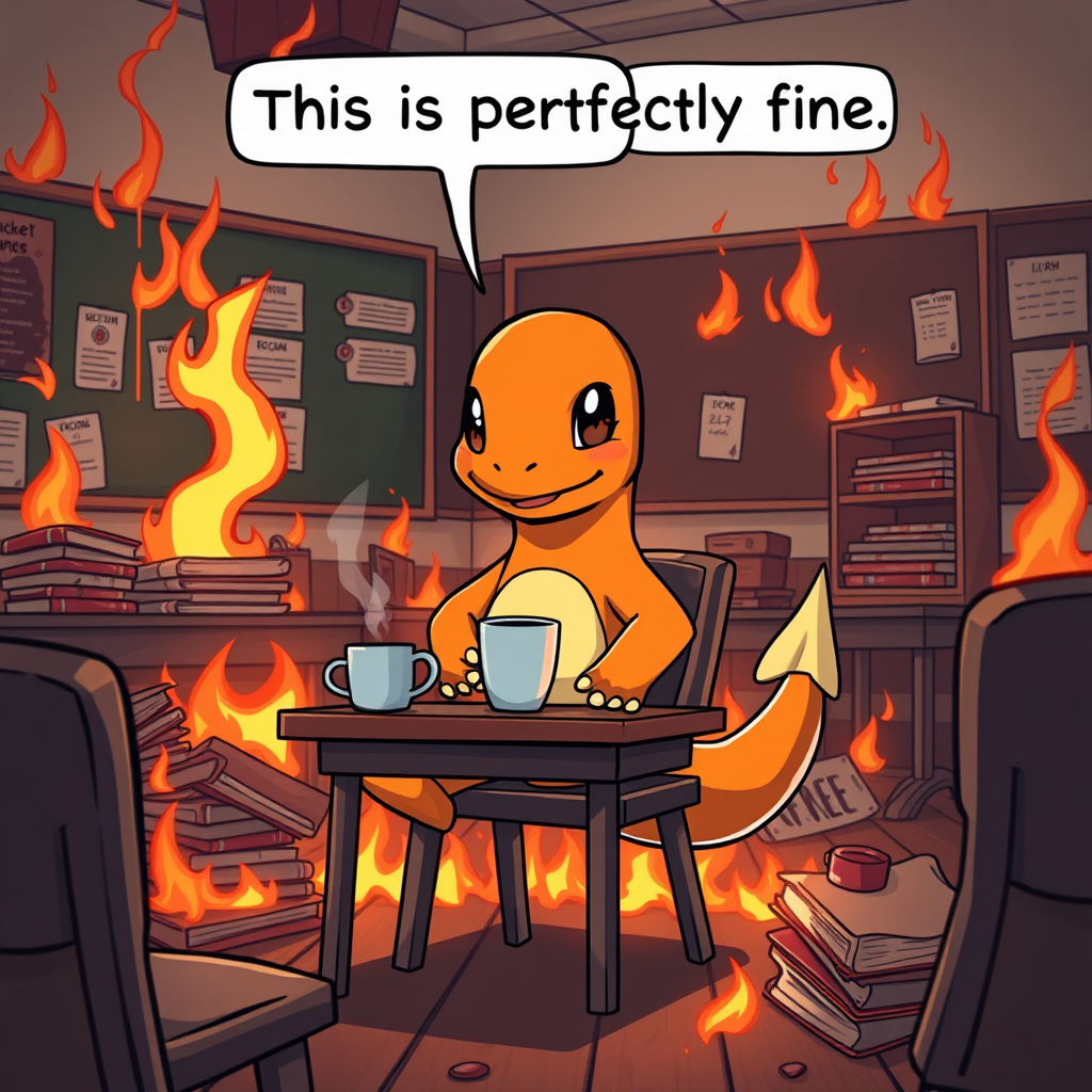 A highly detailed and adorable Charmander sits calmly in a classroom engulfed in flames, clearly proud of the chaos he caused. He is perched on a small wooden chair, a steaming cup of coffee on the desk in front of him. Charmander sports a cheeky grin and his eyes gleam mischievously, reflecting the fiery chaos around him. Above his head, a cartoon speech bubble reads, "This is perfectly fine!" The classroom is filled with charred books, overturned chairs, and walls adorned with lightly singed posters, adding a humorous touch to the scene.