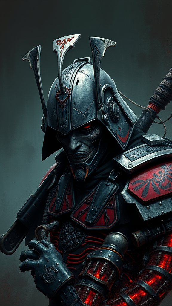 A digital wallpaper portrait depicts a fierce and formidable cyborg samurai supervillain, exuding a badass demeanor reminiscent of anime and comic book styles. Set against a dark background with muted colors, the composition is both epic and dramatic, crafted as a digital painting that evokes profound emotion. Rich in intricate details, the image embraces the chaotic beauty of imperfections, featuring jpeg artifacts and a certain rawness. Elements such as unusual anatomy, extra limbs, and warped proportions add to its grotesque allure. The samurai is adorned in intricate armor, contributing to its imposing silhouette. Despite the distorted features and malformed limbs, the character's presence is dominant and captivating, portraying the striking imagery often found in dark, cinematic universes.