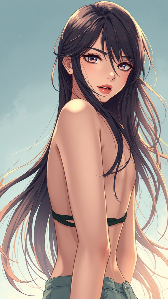 Stunning digital illustration of a 20-year-old girl with her back to the camera, posing with long flowing hair, and an alluring, sultry facial expression. The artwork features natural colors and ultra-detailed elements, set in a niji-inspired style blending comics and anime influences. The scene is captured in high-definition 4k, exuding an unforgettable and very intricate design. While maintaining clarity and sharpness, the composition avoids low-quality elements such as blurriness, plastic textures, or grainy effects, and ensures accurate anatomy, with well-proportioned limbs and features. The image is free from text, names, signatures, watermarks, logos, or any branding. The quality is high, with no jpeg artifacts, cut-offs, or censoring, and presents a refined portrayal focusing on natural beauty and artistic precision.