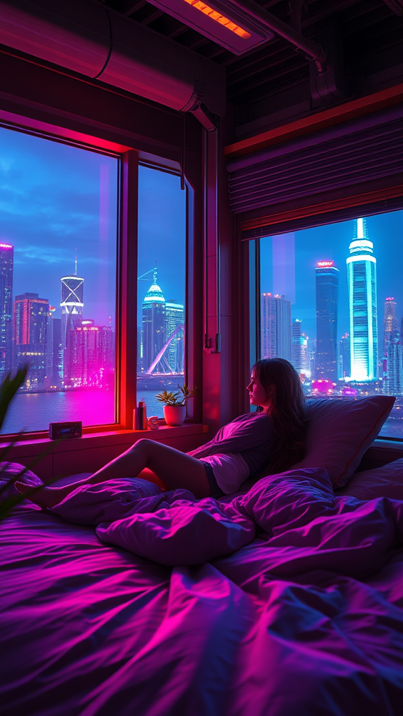 In a girl's room with a cyberpunk atmosphere, neon lights glow vibrantly, casting colorful reflections across the space. The scene is captured with sharp focus and a photorealistic quality, resembling the detail you might find in Unreal Engine 5 renders. The girl reclines on her bed, while a large window offers a breathtaking view of towering skyscrapers in the distance. The room is intricately detailed and reminiscent of artwork found on DeviantArt, combining elements of sci-fi and dystopian beauty. The aesthetic is enhanced with iridescent gold touches and cinematic lighting, creating a stark contrast between dark and vivid hues. Despite the chaotic beauty, there are subtle imperfections, such as elements slightly out of frame, adding an authentic feel of raw artistry and creative exploration.